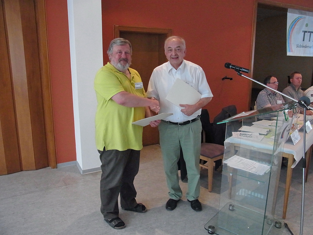 RegVerbTag15 07Am Freitag, den 19. Juni 2015 hat 17 Monate nach der Gründung des Tischtennis-Regionsverbandes Südniedersachsen e.V. zum ersten Mal unser höchstes Gremium getagt: der Regionsverbandstag. Im Restaurant Da Domenico am Schützenplatz in Herzberg konnte Wolfgang Böttcher als Vorsitzender mehr als 130 Vereinsvertreter, die Vorstandsmitglieder, Ressortleiter, Beirats- und Ehrenmitglieder sowie als Gäste Lutz Peters, den Bürgermeister der Stadt Herzberg sowie Jochen Dinglinger als Vertreter der TT-Region Braunschweig begrüßen. Nach den üblichen Formalien zu Beginn und den Grußworten der Gäste standen zunächst die Ehrungen für Thomas Meisel und Matthias Knappe auf der Tagesordnung. Beide wollten auf eigene Wunsch hin nicht wieder für ihre Ämter als stellvertretender Vorsitzdender bzw. als Ressortleiter kandidieren und erhielten daher für ihre langjährige ehrenamtliche Tätigkeit für den Tischtennissport im Kreisverband Northeim/Einbeck und die letzten eineinhalb Jahre im TTRV eine Ehrenurkunde. Anschließend wurden beide mit einem einstimmigen Votum des Verbandstages zum Ehrenvorsitzdenden (Thomas Meisel) bzw. zum Ehrenmitglied (Matthias Knappe) ernannt.